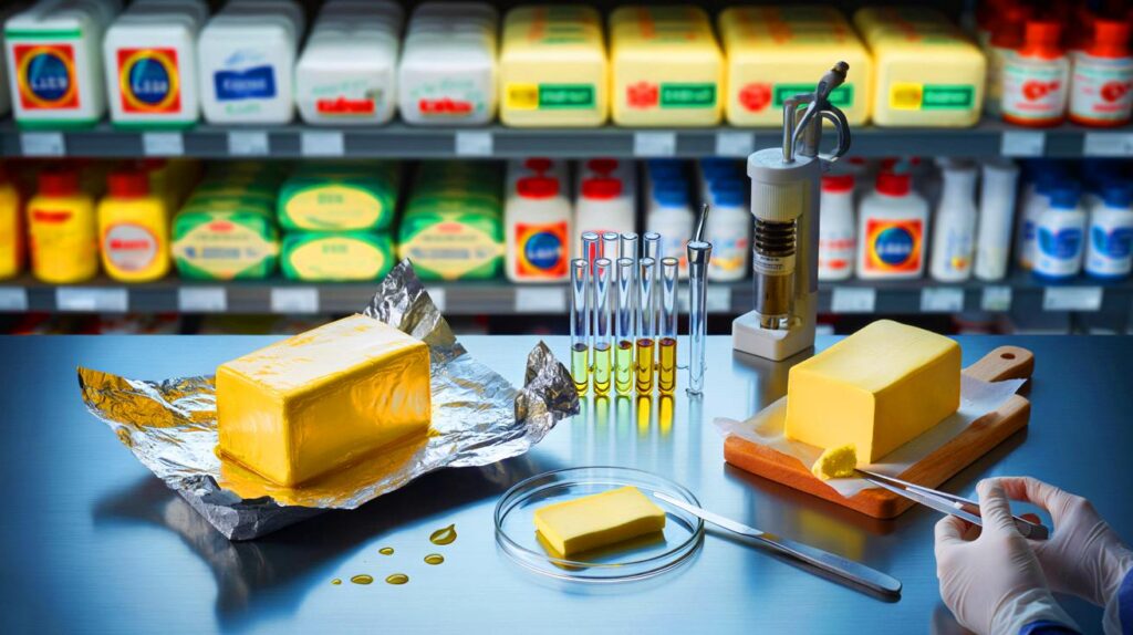 Fett bindet lipophile Substanzen. Genau das macht Butter anfällig für wandernde Rückstände. In der Praxis kommen mehrere Quellen zusammen: die wachs- beziehungsweise kunststoffbeschichtete Alufolie, Druckfarben aus Umkartons, sowie Fette und Öle aus Maschinen.